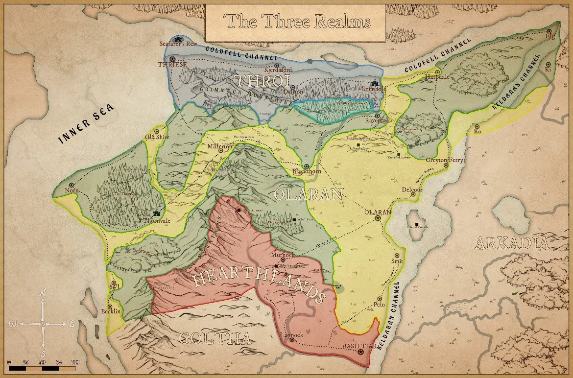 As a player it is up to you to decide who you want to be and how you choose to interact with the world around you. To start, the world we are playing in is called Adrasil, and specifically a Kingdom called Olaran, which, until recently, was a unified human kingdom. After recent events, the kingdom has split into three: The lands to the north of the Grimmock Mountains, as well as parts of Raven, have been taken over by the Sea Lords who have raised the ancient banner of the Realm of Throi. The Hearth-Guard have taken the lands at the southern base of the Fire Mountains, including much of Murnock and some of Lannock. The rest of the kingdom remains Olar. The original kingdom was broken down into nine distinct regions, all of which have their own subtle culture and influence on the people who live there. These regions or provinces will be listed at the end of this section for reference.