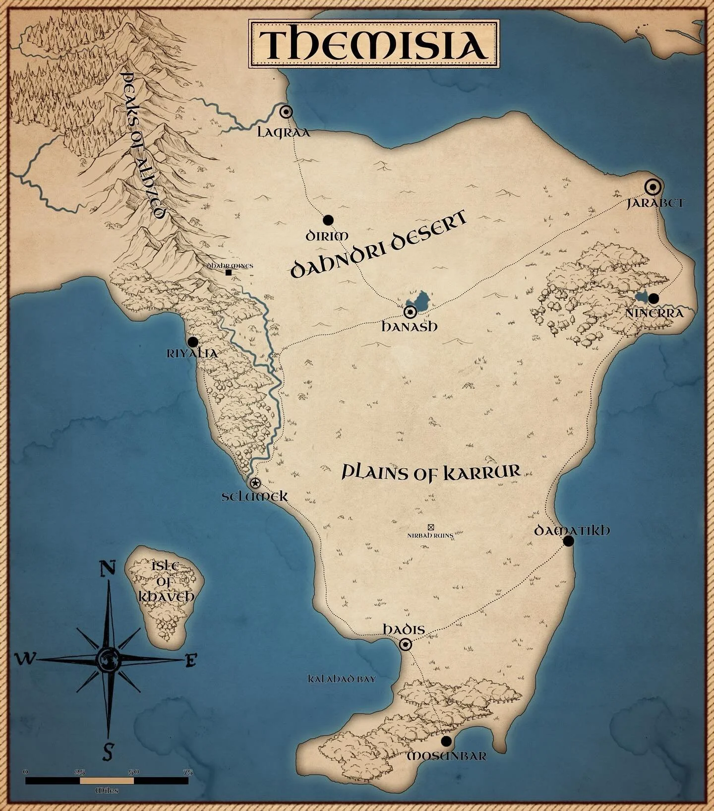 Across the ocean in a land of black sand deserts, craggy mountains, and long coastlines, an ancient empire has existed time out of mind. Long before the tribe later known as the Sea Lords left its shores, the Empire of Themisia was strong. A thousand years later, though beset by enemies and internal strife, Themisia still stands. While Themisia is known for many natural and cultural wonders, it is mostly known for its fierce fighting units: the Agema Phalanx.