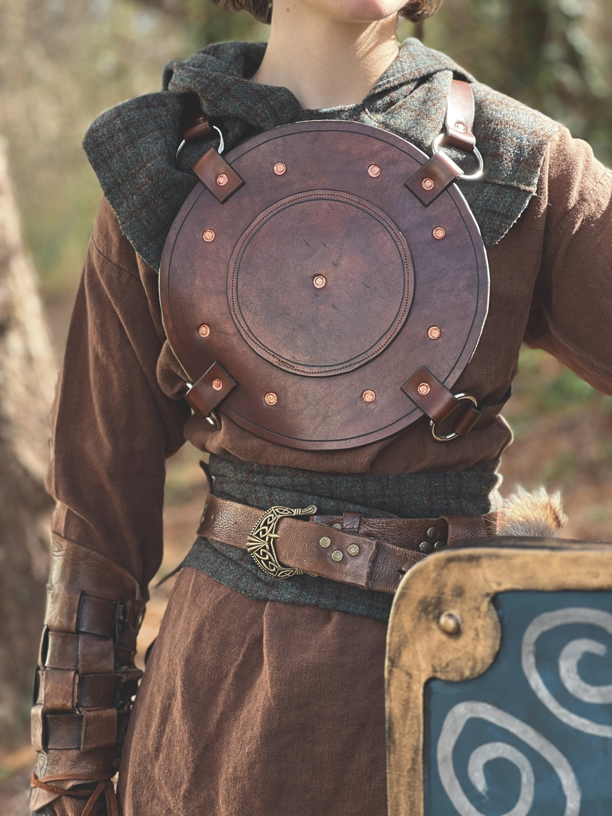 Their colors are unlike any other faction. The Wold Folk are distinguished by the wearing of plaid wool garments and accessories, and their large shields. For other garments, they wear Tan, Brown, and Grey linen with the emblem of the Hand in Teal paint (Details on colors in sections below). If they wear armor, it is Germanic-style sleeveless chainmail or Lorica Hamata. They also wear round bronze or leather chest pieces and Leather or bronze bracers and greaves. They wear Celtic/Germanic-style helmets.